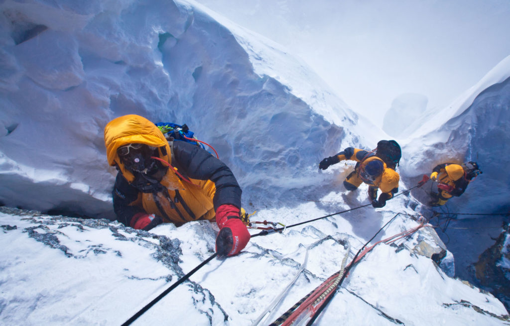 I ensure my crampons are secured into the ice, my safety line is attached and my ascender is locked so I don’t slip and fall. I’m worrying about focus, exposure and image composition. The exhaled moisture from my oxygen mask continuously leaks onto my camera and freezes instantly creating an icy shell around the camera body.
