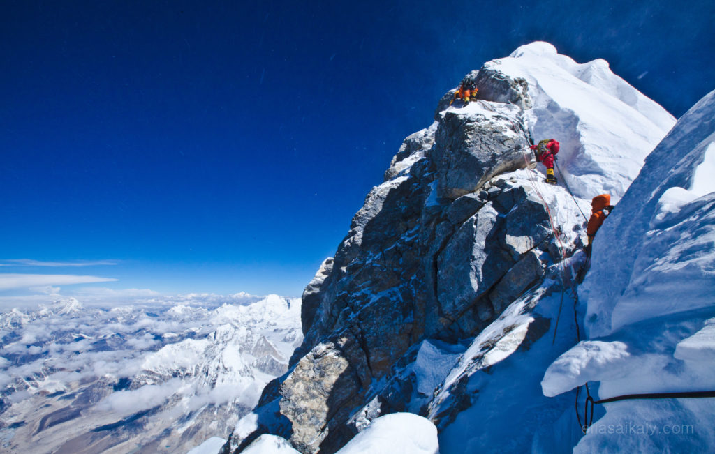 I straddle the rock above the step like a horse and realize I must get ahead of the group in order to capture the team reaching the top. I remove my oxygen mask and ask the team to wait and let me pass at 8,800 metres. I carefully clip and unclip my safety line fourteen times, each time exposing myself to the abyss below, passing every Sherpa and team member in order to get into position for the final shot.