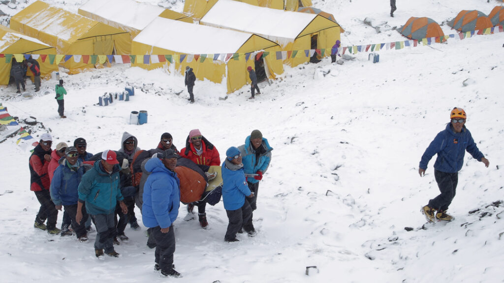 Following the impact, we were unaware of how severe the situation was. Only after I began filming did we realize the scale of destruction. Men with makeshift stretchers carried injured climbers to safety. Intact base camps, such as ours, were converted into places for the walking wounded to await care. Since the entrance of the base camp was unaffected, rescuers converted it into a field hospital. What was once a breathtaking location had quickly become a nightmare.