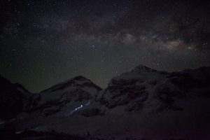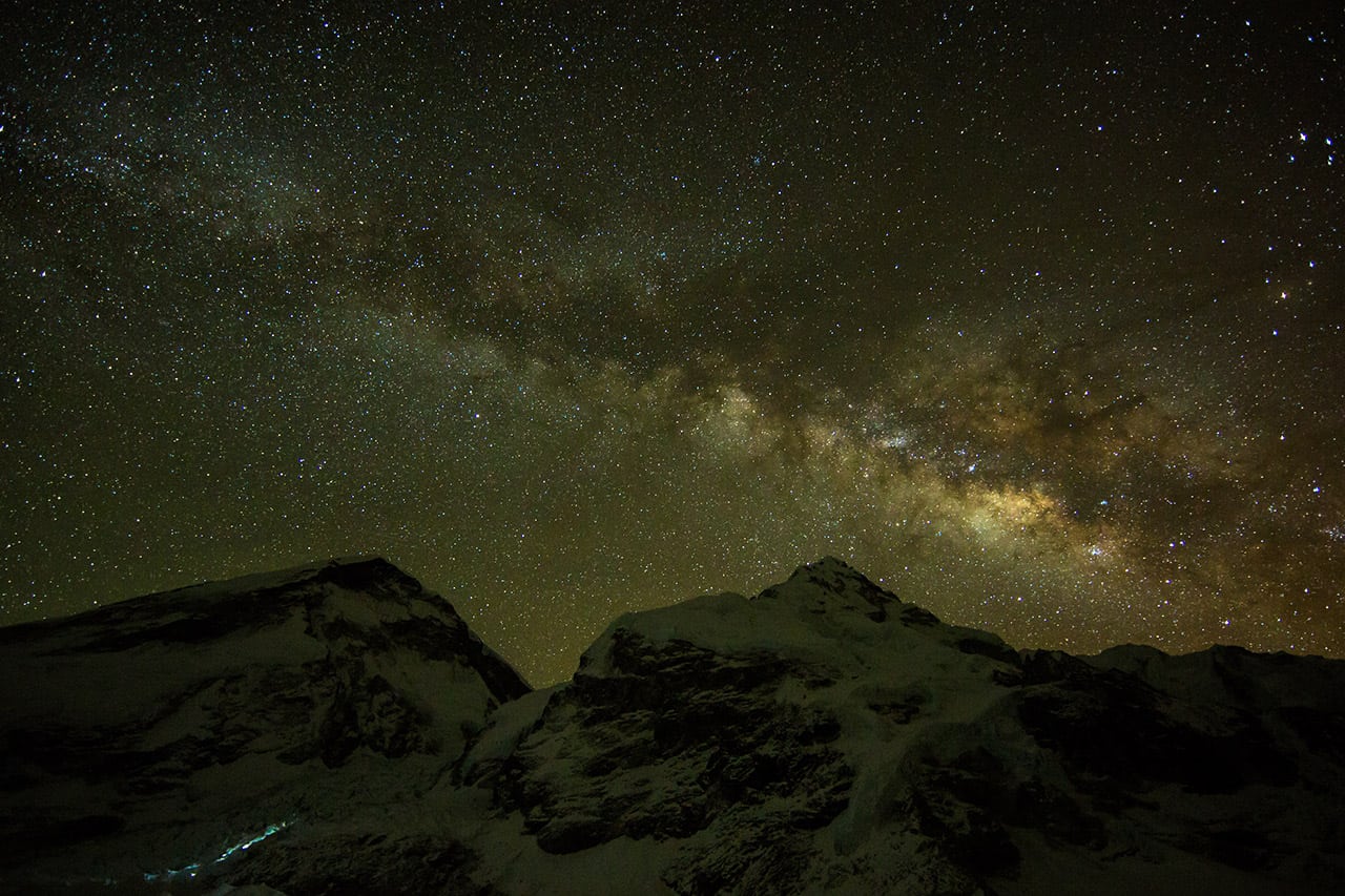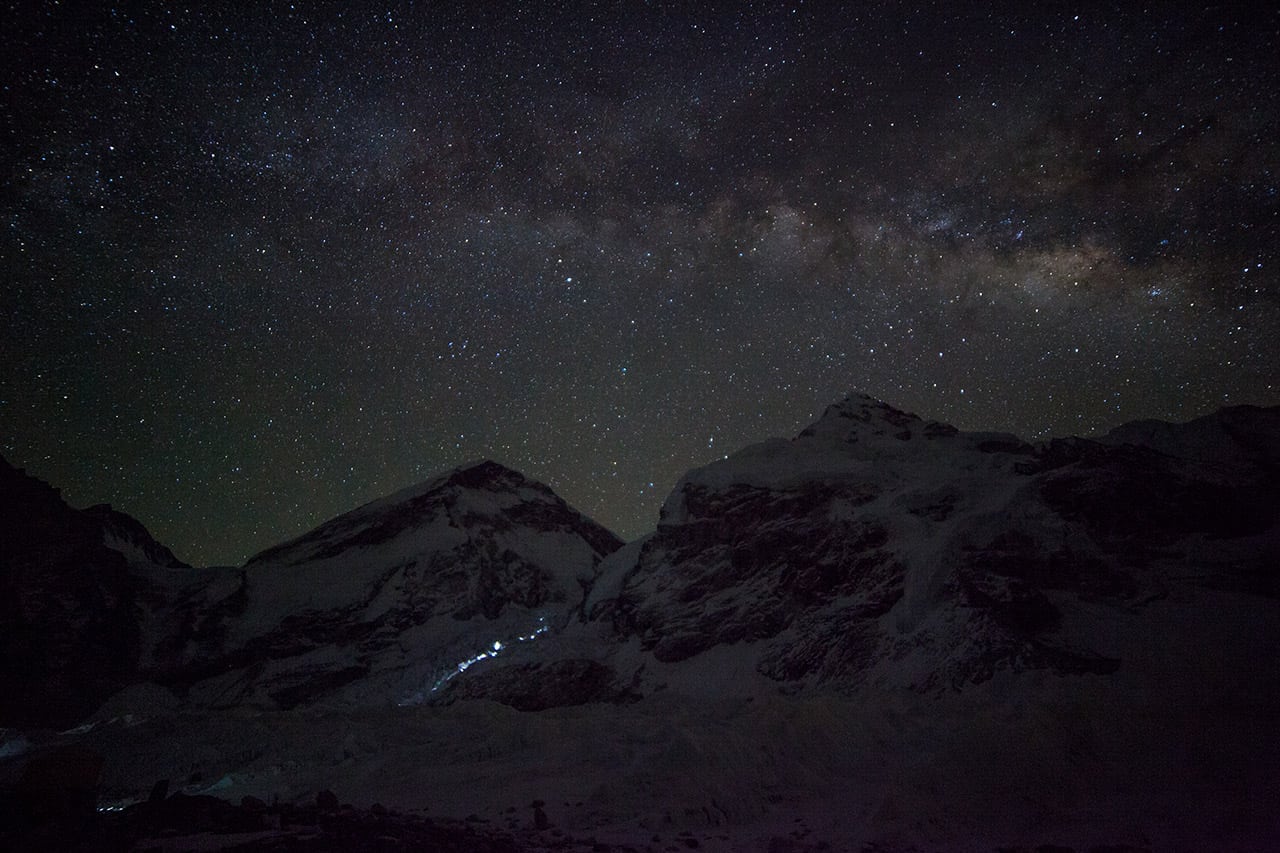 Early morning climbers making their way through the dangerous Khumbu Icefall. The sight of the Milky way at 3am is extraordinary.