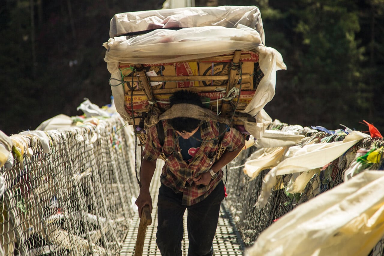 The backbone of all Himalayan expeditions. Here we see a local porter crossing a suspension bridge below Namche Bazaar.