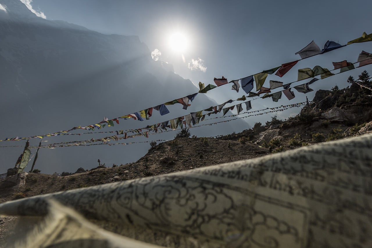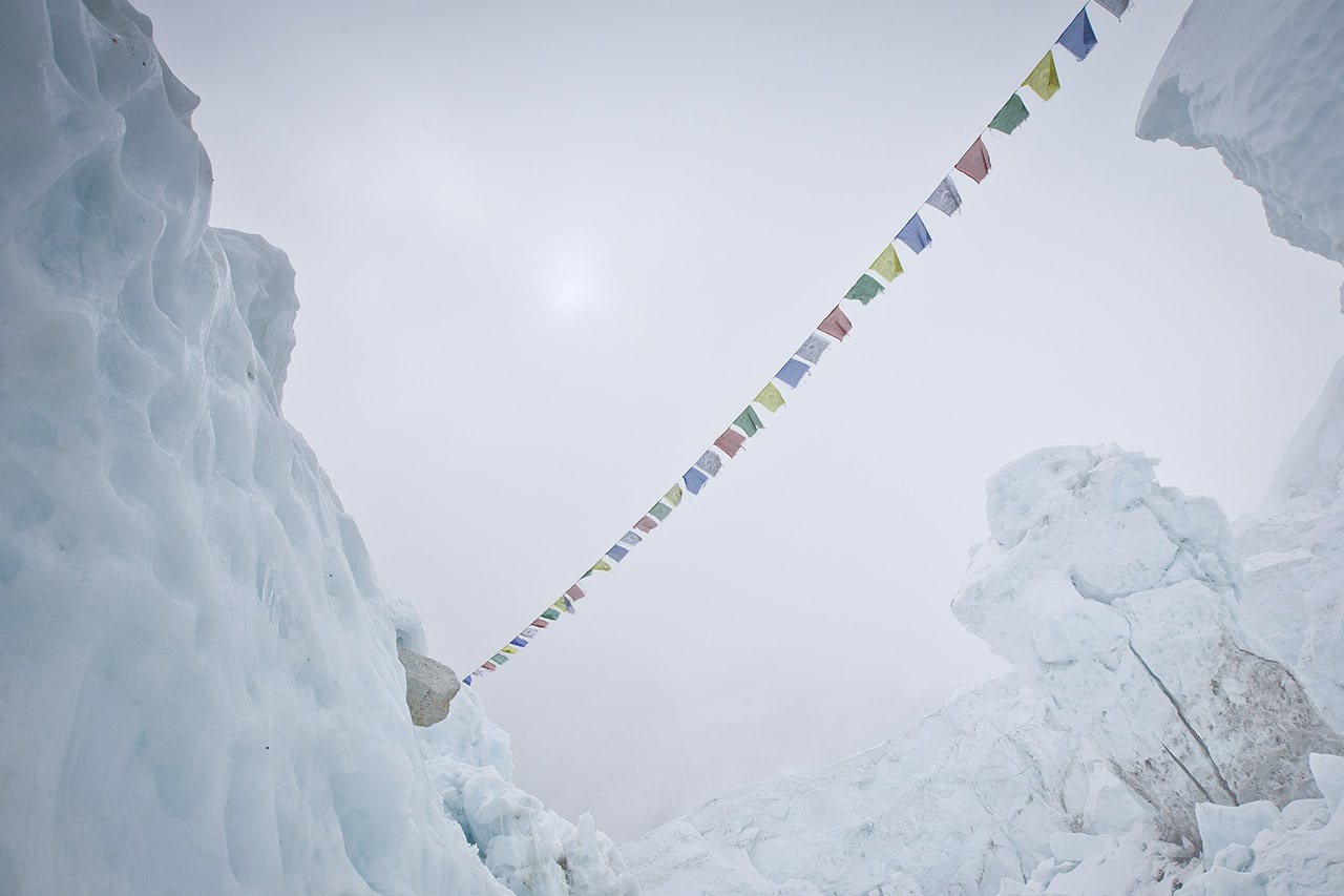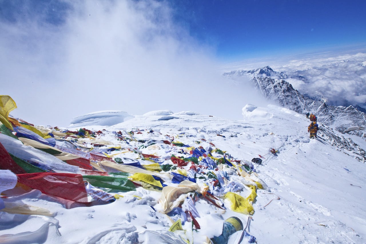 I straddle the rock above the step like a horse and realize that I must get ahead of the group in order to capture the team reaching the top. I remove my oxygen mask and ask the team to wait and let me pass at 8,800 metres. I carefully clip and unclip my safety line, each time exposing myself to the abyss below, over 14 times, passing every Sherpa and team member in order to get into position for the final shot. The last 10 metres end up becoming the most difficult 10 metres of my life. Breath, breath, breath, Step. Step. Step. Breath. Step. Step. Step. Step. My heart is racing, and my breathing is out of control. It’s all mental at this point, and the next thing I know, I’m alone on top of the world. I collapse on the absolute highest point, sit on the prayer flags, take out my camera and begin to roll.