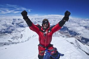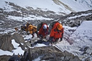 The snow on the small thin path is impossibly loose, forcing me back a half-step with every attempted foot forward. At 8,200 metres, this is an exhausting task. The man’s suit is blue, and his body appears to be hanging upside down! “I’m not going to look, I’m not going to look.” The man lies upside down, dark-skinned, with a slight beard. It appears as though he has been there no more than two days. Emotionally, I know I have to move past him, but as I try, I just collapse right next to him. A part of me feels as though a small piece of me just died. Tears flow down my cheeks, and I can feel my eyelids starting to freeze shut. “I’m sorry for your sister, I’m sorry for your mother, I’m sorry for your father, I’m sorry for your cousin.” On my knees next to a dead body and I feel as though I am absorbing the pain of so many who would soon learn of this man’s tragedy. “This could be me,” I think to myself. This could be any of us. It’s as though I’m feeling my own mortality. More than ever, I want off this mountain. I pay my respects and carry on.