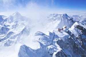I can feel my body is slowly shutting down. The weight of my tripod, two cameras, all of my batteries, including my oxygen, has taken its toll on me. I have been revving at 120% for the past 10 hours and I’m almost out of gas. I am the first to arrive and notice instantly that we have the mountain to ourselves. I gaze ahead and note the sheer beauty of the wind howling and racing across the summit. The tallest peak on Earth is but a few metres away. I realize that I am completely alone making my way toward the Hillary Step. As I make my way toward the iconic obstacle, I look to my left and note the 2,400-metre drop into the Western CWM. I can actually see Camp 2 from where I am standing. I haul myself up the Hillary Step, camera around my neck, oxygen mask pumping oxygen at four litres a minute, and I wait for the team to arrive. What a glorious moment to be the only person climbing the Hillary Step, not a single other human being is around to have to share this precious moment with. So often, dozens freeze and turn back, and now I am just hanging out on top of the step, waiting to capture this unique shot.