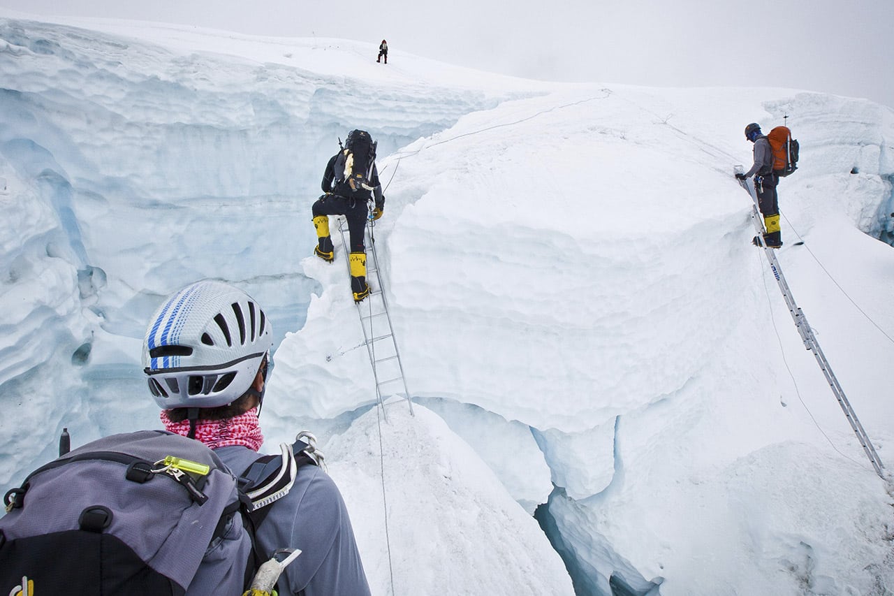 Michael, our lead guide, sets a solid pace for the team, and I do my best to continue capturing footage, climbing ahead, locking myself into the safety line, turning around, grabbing shots, racing ahead, etc. The higher we climb, the more difficult this becomes. As a result, my mind must compensate and carry on. This is the ultimate test of willpower, the moment where your body ceases to function and yet you must carry on stronger than you’ve ever climbed before. This is where my greatest strength resides, in my mind. Tirelessly, I climb with all of my heart. Within 30 minutes of experiencing the most beautiful sunrise of my adult life, I notice a strange shape lying in the snow at the next anchor. I realize a slight moment later, after careful analysis, that I am about to face one of my greatest nightmares. A dead climber. Never before had I laid eyes on a fallen climber, and I quickly realize that not only am I going to see this person up close, but I am going to have to climb over the body! “I’m not going to look, I’m not going to look,” I keep telling myself.