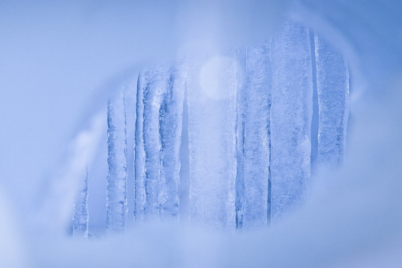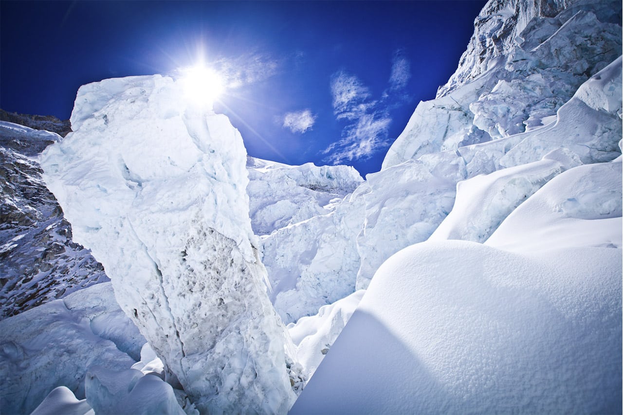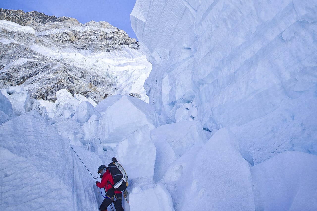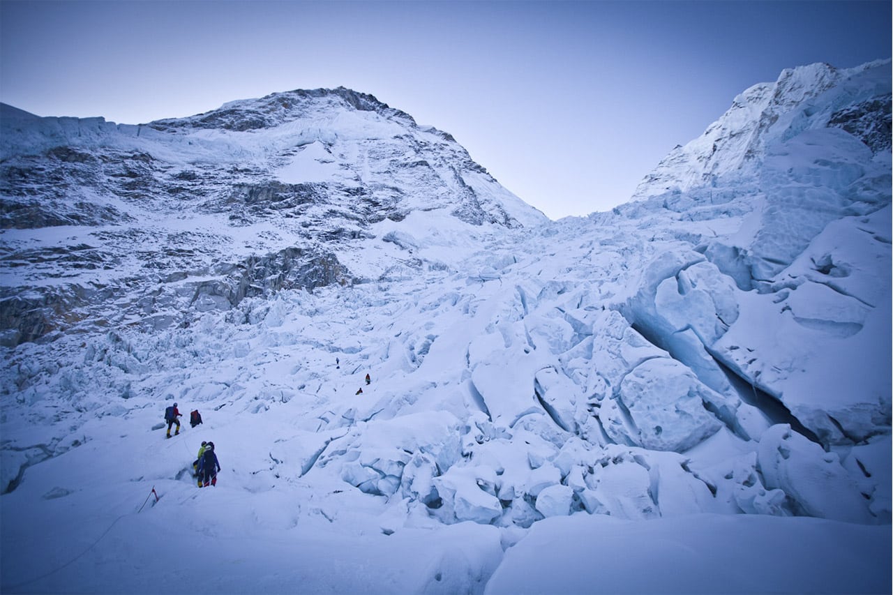 The first five hours of the ascent are spent climbing the triangular face to the balcony. It’s -20 to -30C, the terrain is incredibly steep with mixed rock and ice, and the air is incredibly thin. I easily lead the way, racing ahead with my climbing Sherpa, Pasang (my trusted assistant), and once I’ve gained enough distance on the team, I pull a fresh battery out of my warm down suit, remove my gloves, expose my hands to the cold, pull the camera up from around my neck, crank the ISO to 3200 and film as much as I can. When the lead guide comes within 1.5 metres of where I am dangling, I quickly turn around, cover the lens, expose my hands and pull out the battery and carry on racing ahead. There is an incredible amount of thinking going on in my mind, as I have to ensure my crampons are secured into the ice, my safety line is clipped, my ascender is locked so that I don’t slip and fall. In addition, I’m worrying about focus, exposure and composition. The exhale moisture of my oxygen mask continuously leaks onto my camera and freezes instantly, creating an icy shell around the body. I continuously think to myself, This is only going to last so long before the camera malfunctions. And that’s why I have four cameras with me. Every opportunity I can create, I race ahead, pull out a warm battery, expose my hands to the cold, grab a shot, repeat, and continue racing ahead. This goes on for five hours under a bed of stars and partially moonlit sky. When the team breaks, I stop, clip in somewhere, quickly drop my pack, devour a few energy gels, consume 1/4 litre of water in the sub-zero temperatures, grab a few quick shots of the guys in the dead of the night, race ahead and carry on. Arduous, repetitive and hypnotic, but the adrenalin seems to make the time pass relatively quickly.